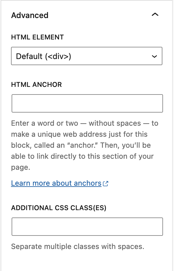 “高级”选项卡允许您指定用于该分组的HTML元素,并为您的区块添加HTML锚点和CSS类。