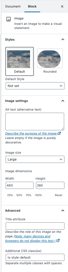当您向文章或页面内容添加新区块时,它会自动在右侧菜单中显示该区块的设置。