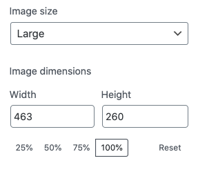 图片尺寸设置允许您手动设置高度和宽度,或将图片设置为其完整尺寸的25%、50%、75%或100%。还有一个重置按钮,以防您需要恢复更改。