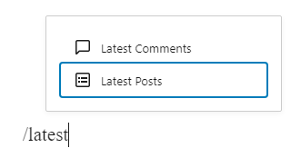 最新文章块 可以通过点击“添加块”按钮添加到页面。它可以在 小工具 部分找到。或者,您可以输入 /latest 并点击 最新文章。