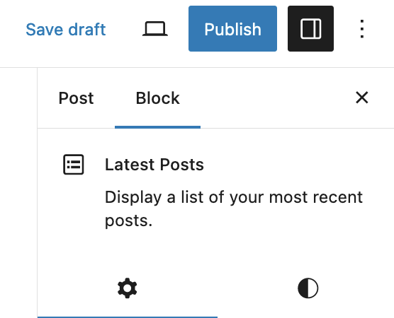 除了块工具栏中的选项外,每个块在编辑器侧边栏中都有特定的选项。如果您没有看到侧边栏,只需点击“发布”按钮旁边的“齿轮”图标。