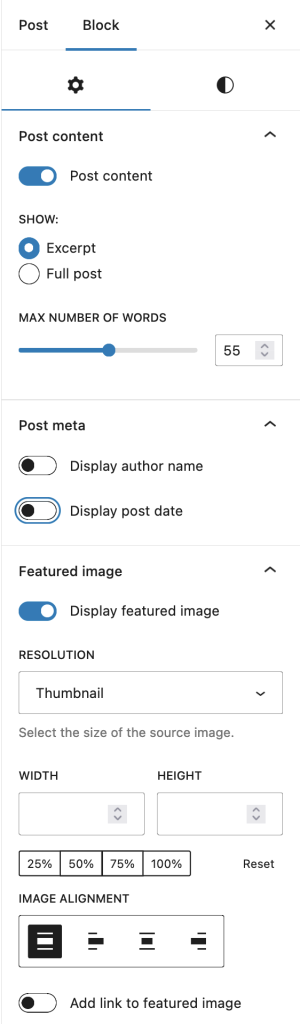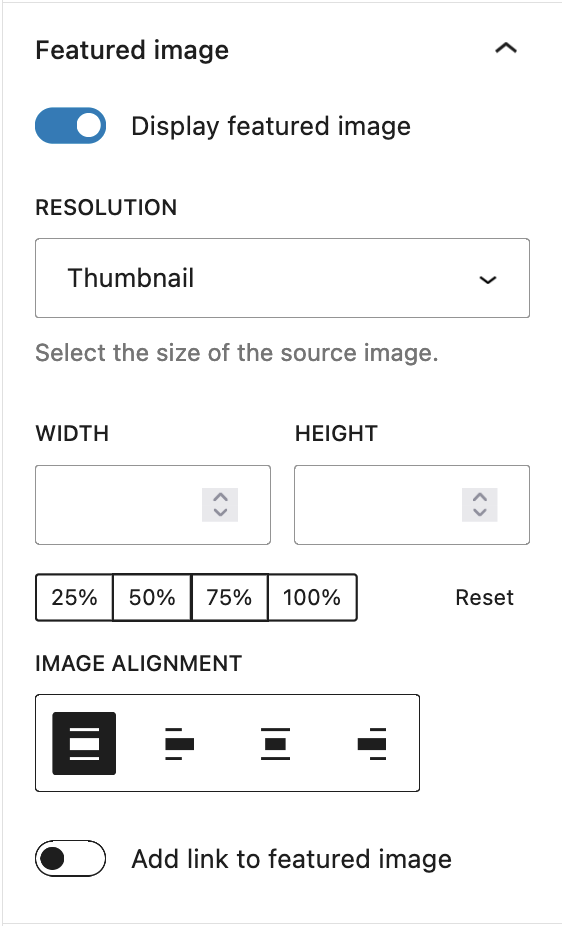 使用特色图片设置,您可以选择分辨率、尺寸、对齐方式以及是否希望图片链接到文章本身。