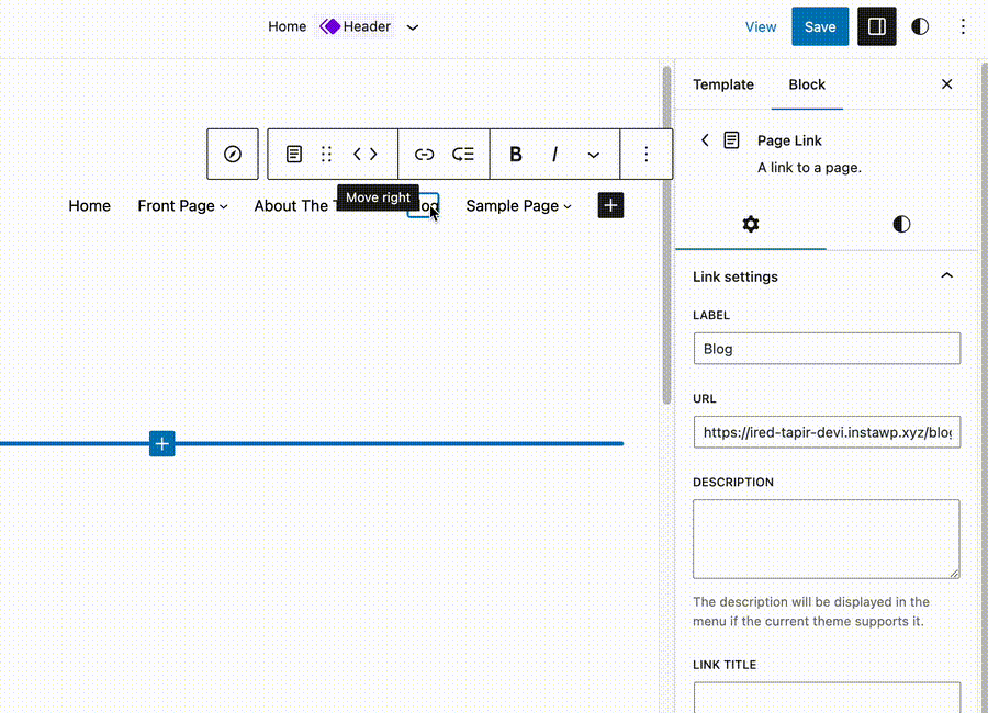 下一步是将单独的块添加到您的导航中。您可以从编辑器画布或设置面板中的列表视图执行此操作。