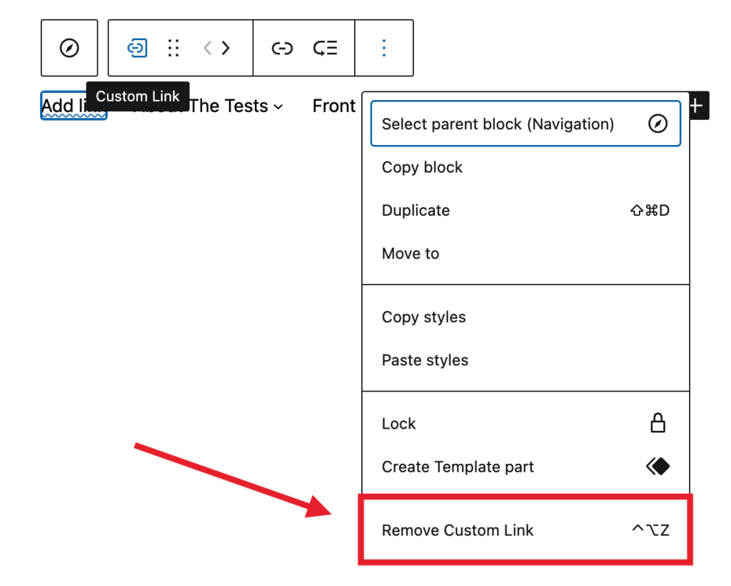 当您选择页面链接或自定义链接等块时,将出现一个弹出窗口,您可以在其中搜索或输入菜单项的URL,切换在新标签页中打开选项,并将该块转换为其他类型。