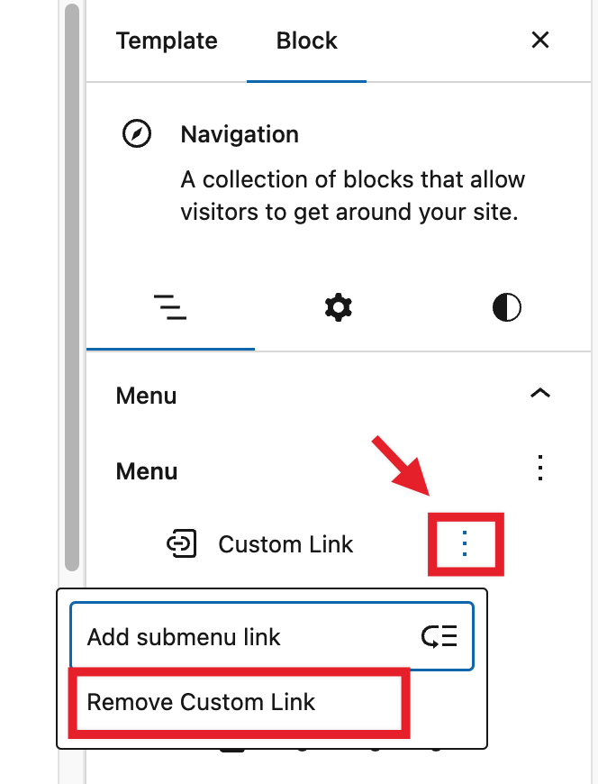 您可以从块设置列表视图和编辑器画布中自定义导航块内容。