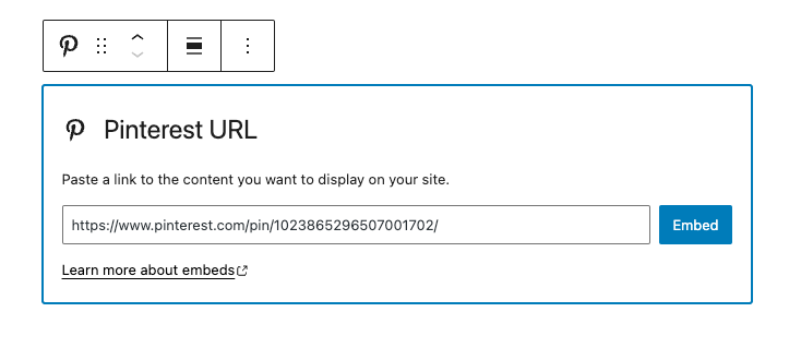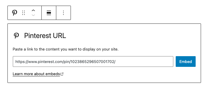 通过编辑 URL,您可以在嵌入块中更改 Pinterest 嵌入 URL。覆盖现有 URL 并点击右侧的“嵌入”按钮。