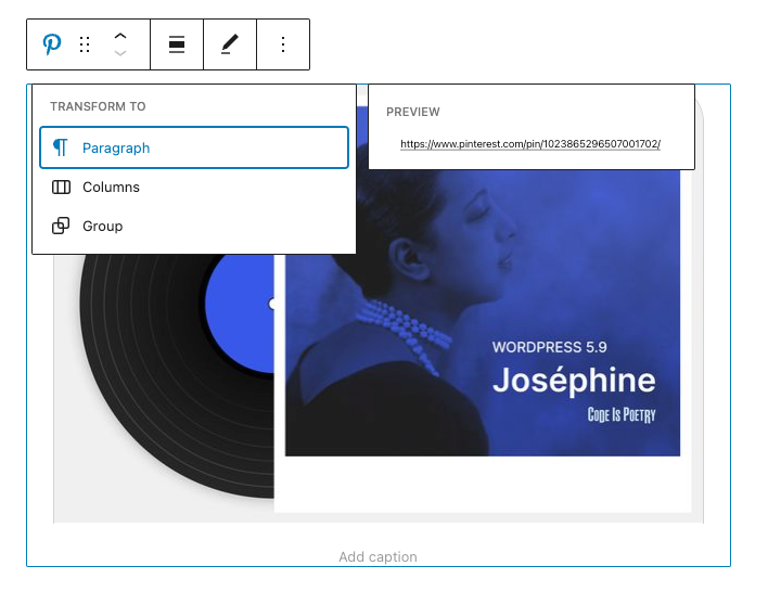 第一个选项允许您将 Pinterest 嵌入块转换为段落。这将把嵌入的 Pin 图、图板或 Pinterest 个人资料转换为链接。您还可以将 Pinterest 嵌入块转换为列或组。