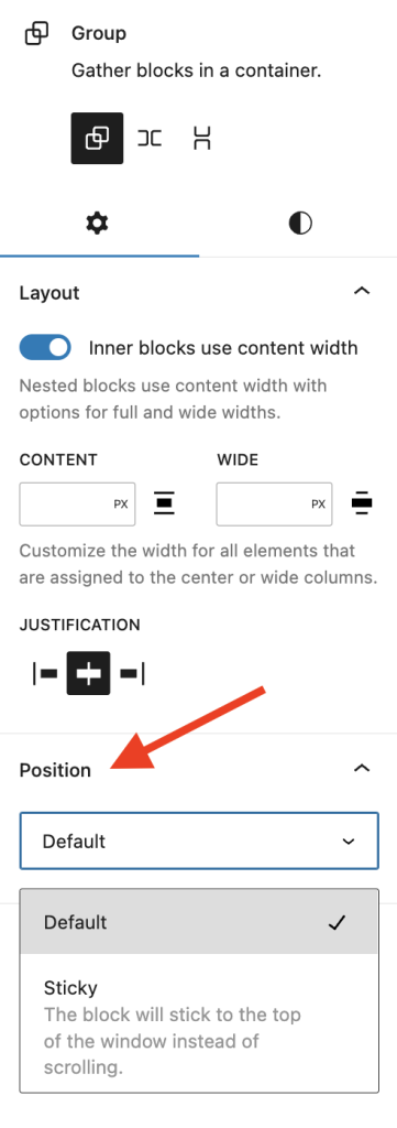 要访问位置设置,请将组、行或堆叠区块添加到内容的根目录,即不放置在另一个区块内。在您添加的区块的区块设置侧边栏中,您将找到位置部分,如下图所示。
