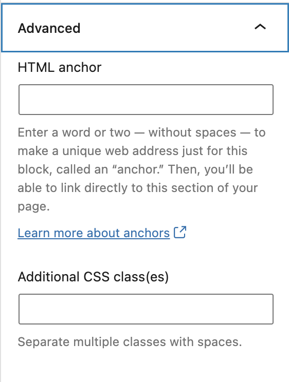 高级选项卡允许您为块添加HTML锚点和CSS类。