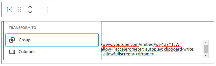 你可以将短代码区块转换为分组或列,以便进一步对区块应用自定义设置。