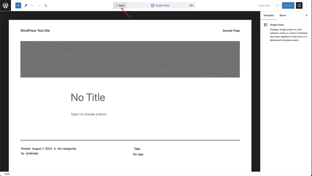 - 这将打开模板编辑器并带您进入模板编辑模式,您可以在其中对所选模板进行更改。要返回WordPress区块编辑器并继续进行内容更改,请点击编辑器顶部面板中的返回链接。