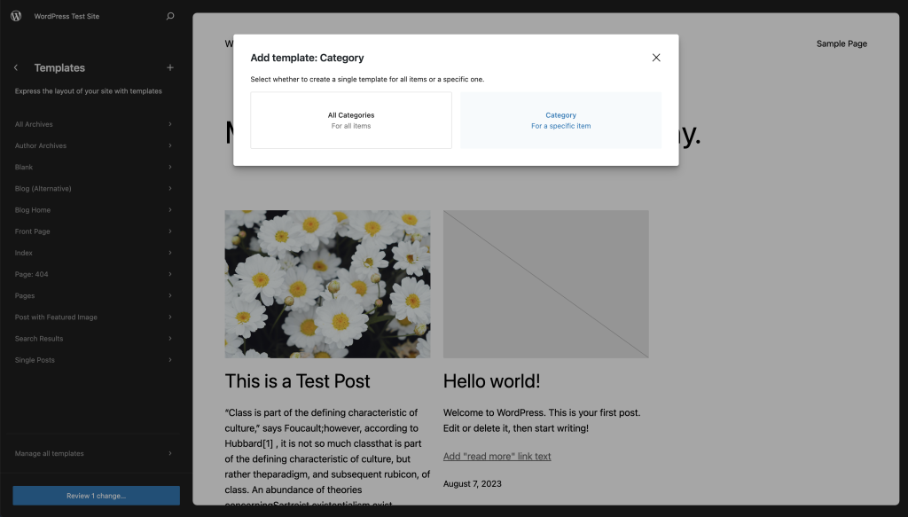 在“所有分类”或“分类”之间做出选择后,您将被带到模板编辑器,您可以在其中设计模板的布局。