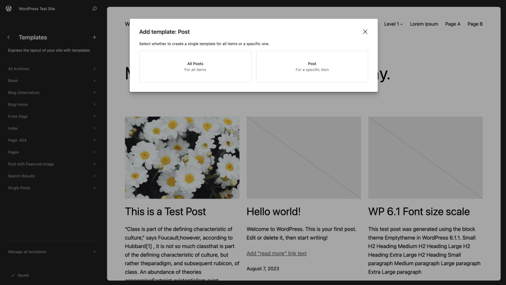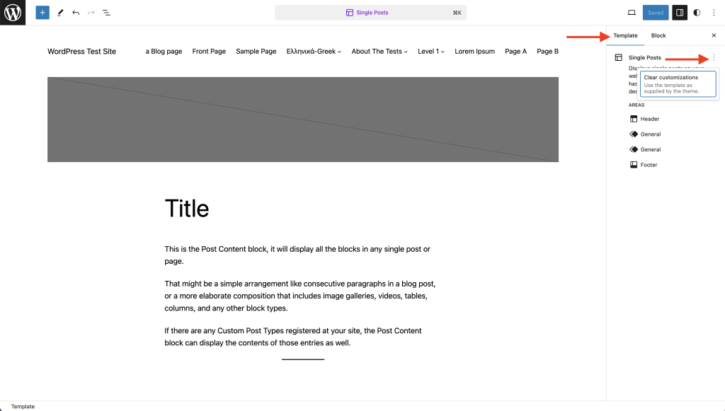 模板编辑器允许您使用区块编辑和创建模板。这些模板控制您站点上文章、页面或页面类型的布局。