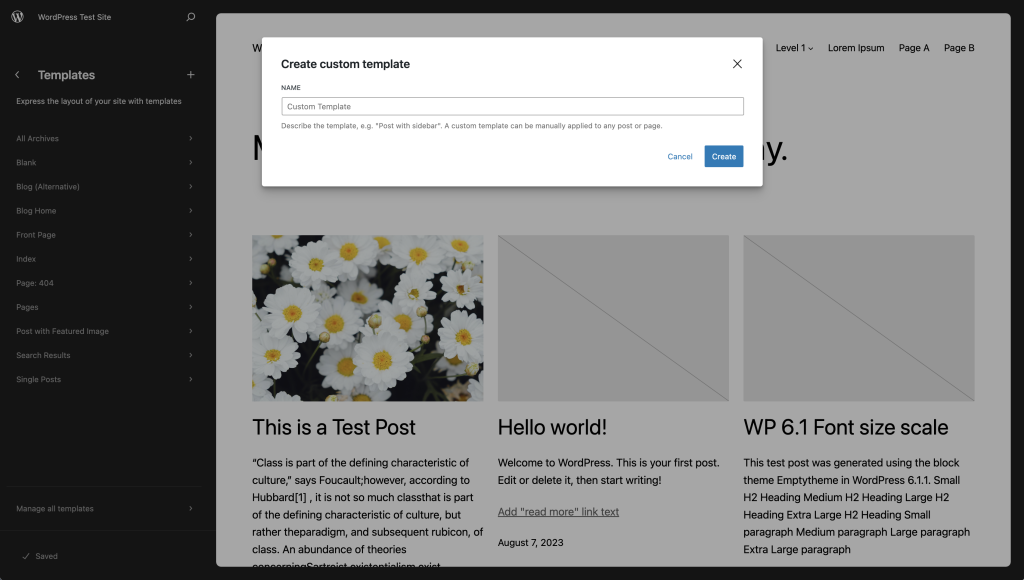 在出现的对话框中,为新的自定义模板命名,然后点击创建。确保名称能够描述模板,例如:“带侧边栏的文章”。