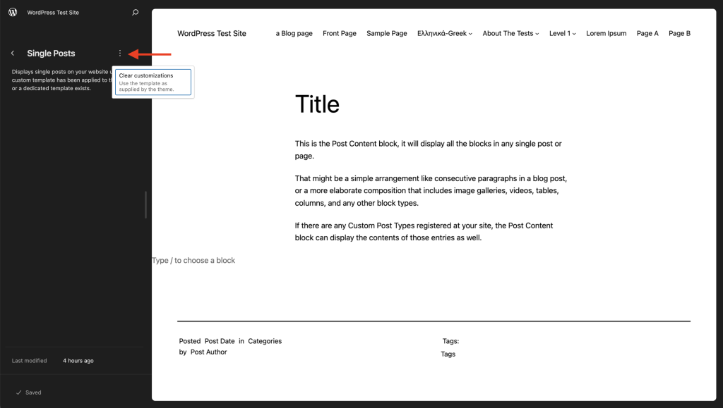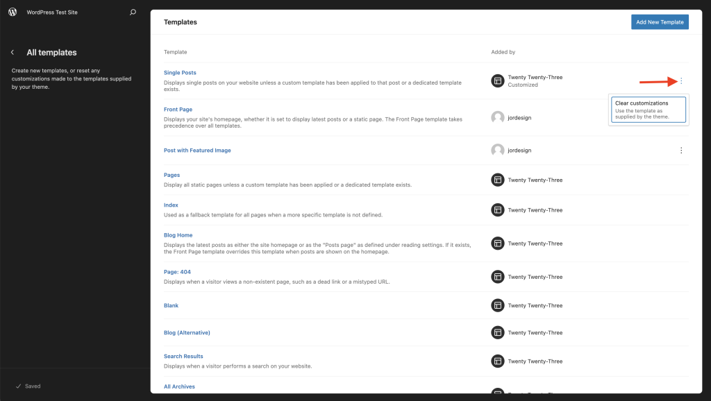 - 点击模板设置侧边栏中的三点菜单图标。这将打开一个下拉菜单。选择清除自定义。这将把模板重置为默认状态,您将失去对该模板所做的更改。您将在窗口左下角看到一条消息:模板已恢复。