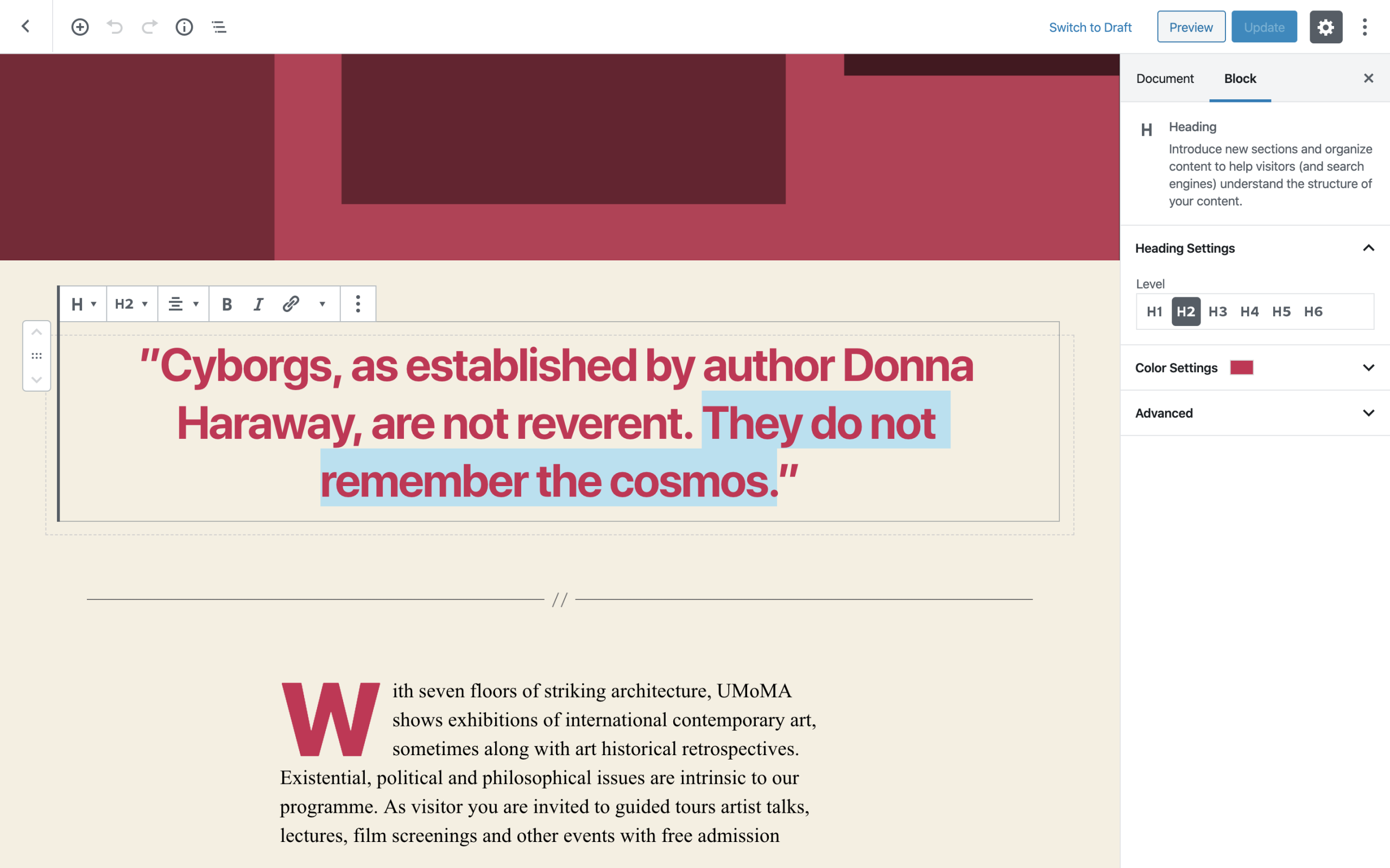 您站点上元素的颜色会根据您选择的背景颜色自动计算。这确保了颜色对比度始终足够高,以便所有访问者都能访问。